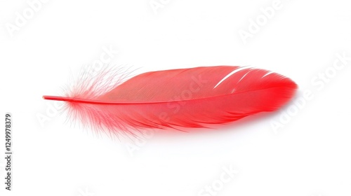 Vibrant red feather resting on a white background, showcasing delicate details and textures