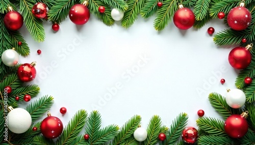 Vibrant red, green, white ornaments & branches form festive Christmas border , celebration, design element, traditional