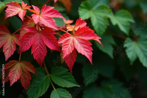 Vibrant red leaves in clusters on a green vine, nature, red leafy vine plant, garden