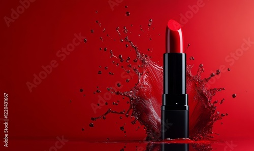 Vibrant Red Lipstick Splash with Dramatic Background, Opened Tube, Bold Color Cosmetics Concept, Generative AI