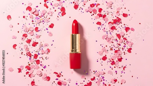 lipstick, red lipstick, make-up, beauty, cosmetic, glamour, fashion, vibrant, bold, pink, red, confetti, flower petals, floral, romantic, celebration, festive, luxury, elegance, still life, topview, beauty product, cosmetic product, valentine, love, feminine