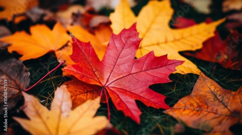 Vibrant Red Maple Leaf on Green Grass with Autumn Colors