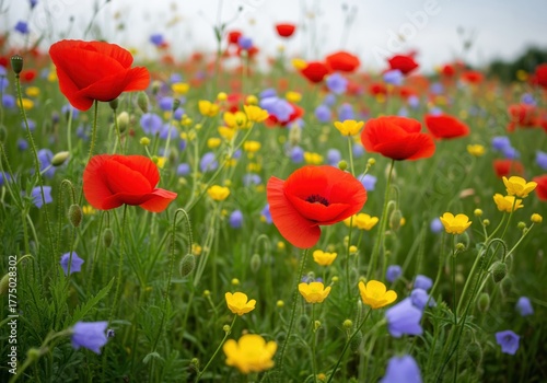poppy, buttercup, wildflower, meadow, red, yellow, bloom, flower, field, summer, blue, green, vibrant, colourful, nature, spring, season, botany, flora, lush, garden, outdoors, environment, growth, rural, peaceful, serene, bright, closeup, beauty, abundance, foliage, stem, papaver, ranunculus, bellflower