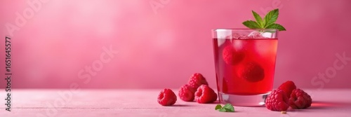 Vibrant red raspberry cocktail, pink backdrop, macro, food