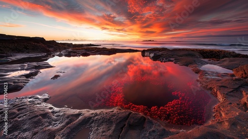 Vibrant red rockpool created by algae blooming