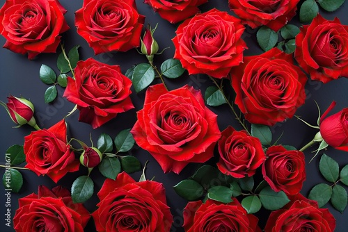 Vibrant Red Rose Flower Scene in a Flat Lay Setting � A Romantic Motif
