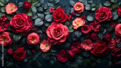 Vibrant red roses floral pattern wallpaper with hyper-realistic details