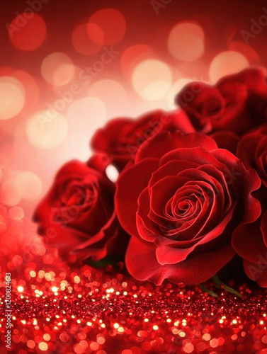 Vibrant red roses with sparkling bokeh background, creating romantic and elegant atmosphere