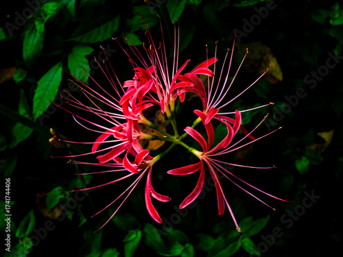Vibrant Red Spider Lily (Lycoris radiata) flower in full bloom, top view on a dark background.