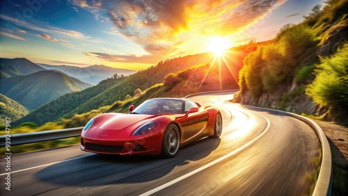Vibrant red sports car speeding down a winding road, sunlight glinting off sleek curves, capturing the thrill of freedom and open-road adventure.