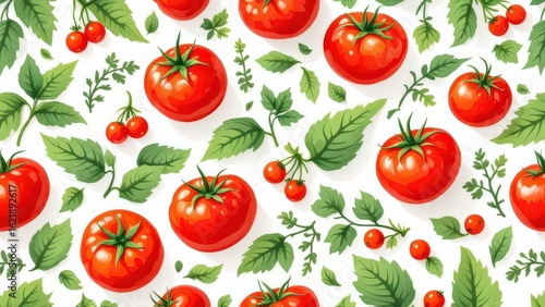 tomatoes, tomatoes, fruit, vegetable, produce, food, fresh, ripe, red, green, leaf, herb, basil, parsley, mint, garden, organic, natural, healthy, nourishment, diet, culinary, cooking, ingredient, cookery, garnish, favor, taste, summer, season, harvest, agriculture, farm, field, growth, plant, botany, botanical, illustration, pattern, seamless, repeat, background, texture, design, graphic, art, digital, vibrant
