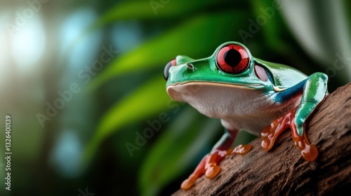 Vibrant red-eyed tree frog on branch in lush greenery
