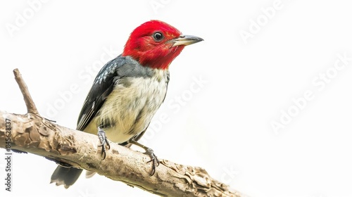 vibrant redheaded bird perched on branch against white background colorful avian wildlife photography