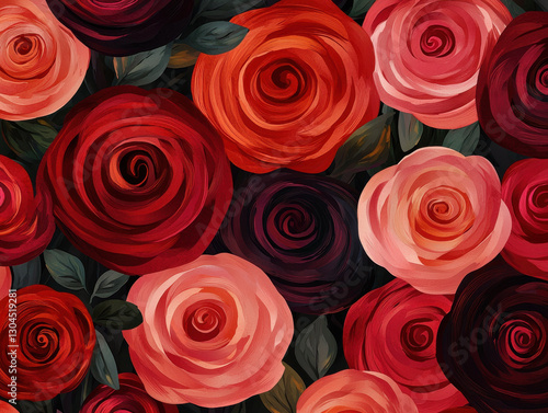 Vibrant rose pattern with red, pink, and dark blooms, creating romantic floral design