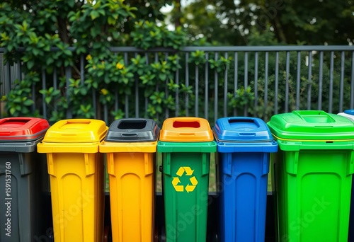 Vibrant row of colorful recycling bins for waste disposal, eco-friendly, conservation