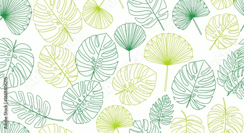 Vibrant seamless pattern of hand-drawn tropical leaf outlines in diverse green tones, perfect for botanical backgrounds, modern textile designs, and decorative projects