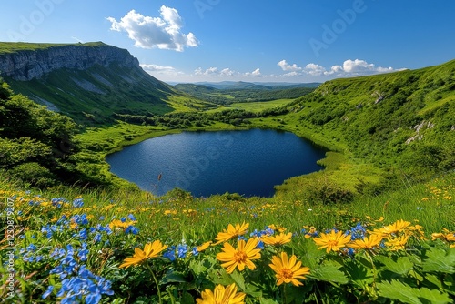 Vibrant Serene Lake Scenery with Wildflowers Majestic Mountains