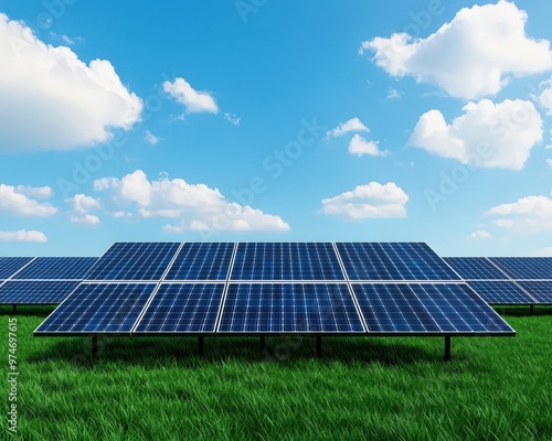 Vibrant solar panel array on lush green grass under a clear blue sky, symbolizing renewable energy and sustainable technology.