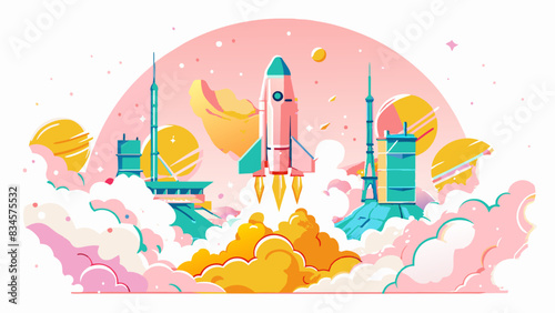 space, rocket, launch, futuristic, city, illustration, vibrant, colourful, exploration, science fiction, skyline, skyscraper, adventure, modern, artwork, design, digital, graphic, concept, technology, travel, cosmos, galactic, innovative, flight, journey, cloud, planet, star, universe, fantasy, pink, yellow, architecture, urban, metropolis, sky, ascent, development, progress, mission, escape, imaginative, bold, trendy, artistic, vector