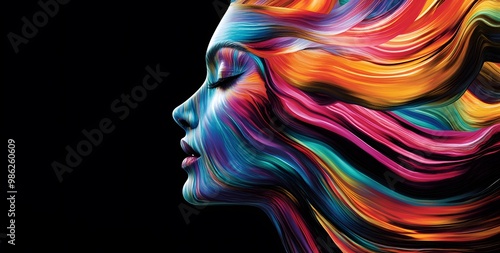 woman, profile, colourful, imagination, rainbow, dream, streak, hair, black, background, vibrant, artistic, expression, flowing, line, creativity, portrait, colours, spectrum, symphony, silhouette, high-coloured, mind, cascade, chromatic, brilliance, abstract, art, human, dynamic, movement, texture, fine, curve, emotion, face, atmosphere, grace, elegance, monochrome, wind, gentle, breeze, balance, strength, softness, copy space, ribbon, many-coloured