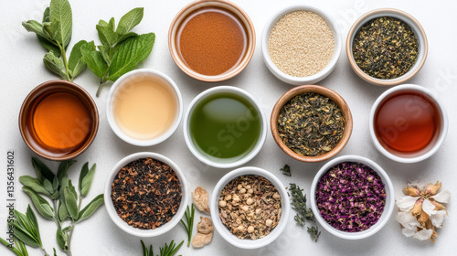 vibrant spread of different herbal tea blends, dried herbs, and spices arranged beautifully