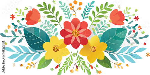 floral, flower, bouquet, arrangement, blossom, bloom, flower petals, leaf, greenery, foliage, red flower, yellow flower, summer, nature, botanical, illustration, graphic, design, vibrant, colourful, bright, cheerful, happy, pretty, beautiful, elegant, romantic, festive, decoration, ornament, artwork, art, pattern, background, wallpaper, textile, fabric, print, card, invitation, wedding, celebration, floral pattern, floral arrangement, flora, bloom, blossoming, colorful flowers