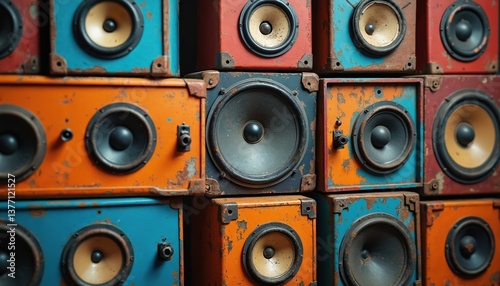 Vibrant stack of colorful, aged speakers for immersive audio experience. Orange, blue hues with rustic, weathered finish, creating retro vibe. Loudspeakers, powerful sound.