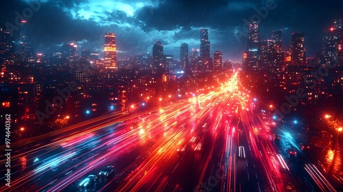 Vibrant streaks of car lights cutting through a night city street, with buildings glowing in the background. The 3D illustration enhances the sense of urban energy
