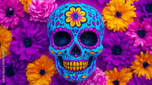 Vibrant sugar skull surrounded by colorful flowers celebrating life and death in a festive atmosphere