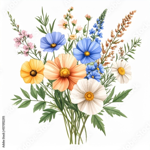 flower, bouquet, floral, cosmos, wildflower, blue, orange, white, pink, summer, spring, garden, botanical, illustration, flower, arrangement, design, bright, colours, pastel, vibrant, colourful, nature, beauty, delicate, pretty, elegant, artistic, artwork, painting, digital, art, graphic, image, background, wallpaper, bloom, blossom, flora, plant, green, leaf