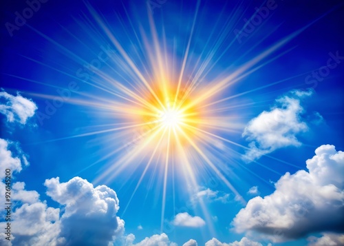 Vibrant sun shines brightly with intense lens flare against a cloudless blue sky, casting warm sunrays with ample copy space, evoking a sense of summer serenity.