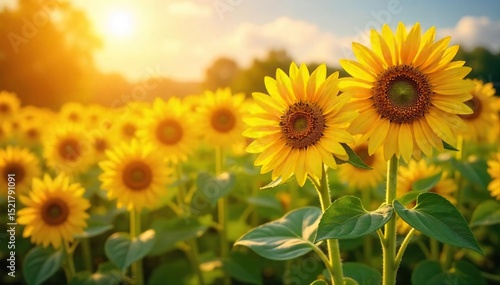 Vibrant sunflowers in full bloom, basking in the golden sunlight A stunning display of nature's beauty, perfect for summer themes and backgrounds , stem, garden