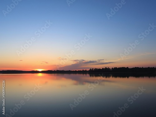 Vibrant sunrise over a calm lake with silhouetted trees in the foreground, serene, nature