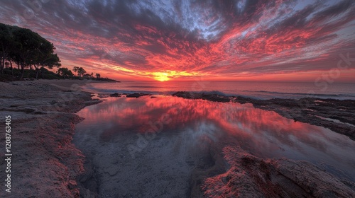 Vibrant sunrise over coastal rocks reflecting fiery sky
