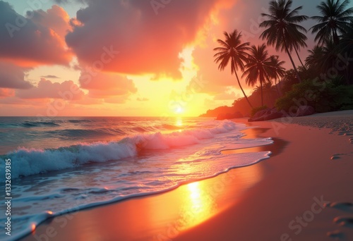 vibrant sunrise over lush beach landscape rich colors reflecting calm waves sandy shore, horizon, palm, ocean, paradise, scenery, sunlight, coastal, nature