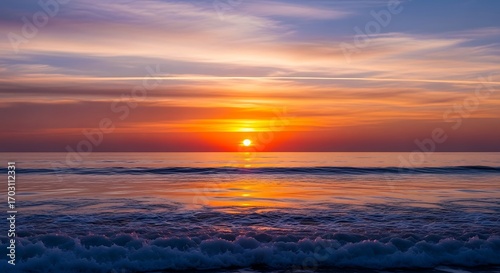 sunrise, ocean, wave, beach, sky, horizon, sunset, water, cloud, colours, vibrant, orange, red, purple, morning, light, calm, serene, peaceful, tranquil, beautiful, scenic, view, landscape, seascape, coast, shore, nature, scene, vista, panorama, gold, sun, ray, glow, bright, daybreak, dawn, twilight, atmosphere, cloudscape, sea, wave, foam, sand, coastline, shoreline, natural