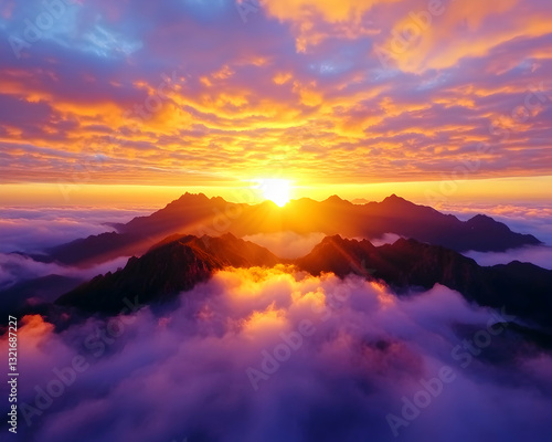 Vibrant sunrise paints the sky with oranges and purples illuminating a mountain range nestled in clouds