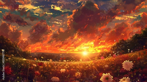 sunset, nature, landscape, sky, cloud, dramatic, dramatic sky, field, meadow, flower, daisy, daisy, vibrant, orange, red, yellow, glow, scenic, serene, tranquil, beautiful, idylli, peaceful, romantic, mystical, aethereal, magical, fantasy, imagination, environment