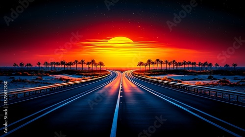 sunset, highway, road, palm tree, tropical, vibrant, orange, red, dramatic, symmetric, journey, adventure, travel, vacation, road trip, transportation, sky, landscape, horizon, colours, composition, depth, balance, warm, cool, time, nature, scenic, background, image, photo, photo, stock, marketing, business, design, graphic, visual, concept, template, website, banner, illustration, element, asset
