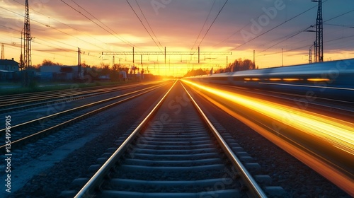 Vibrant sunset illuminating train tracks with speeding trains creating dynamic light trails on the horizon : Generative AI