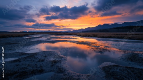 Vibrant Sunset Landscape with Puddle Reflections