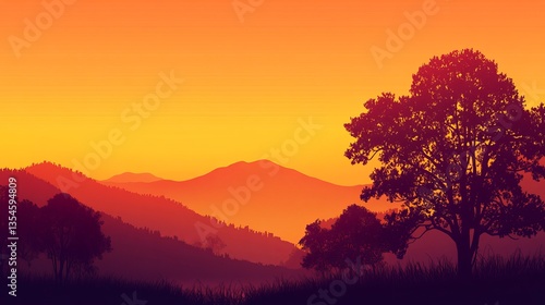 Vibrant sunset landscape with silhouetted trees and mountains, creating a serene atmosphere