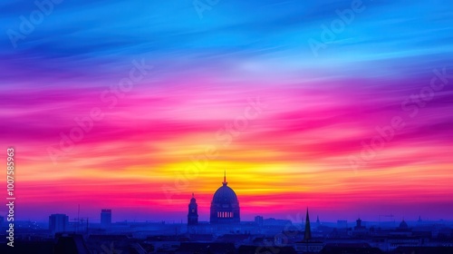sunset, city landscape, skyline, city, building, dome, architecture, urban, dusk, twilight, evening, cloud, sky, colourful, vibrant, colours, horizon, landscape, nature, photographic, beautiful, scenic, picturesque, travel, german, europa, art, illustration, photo