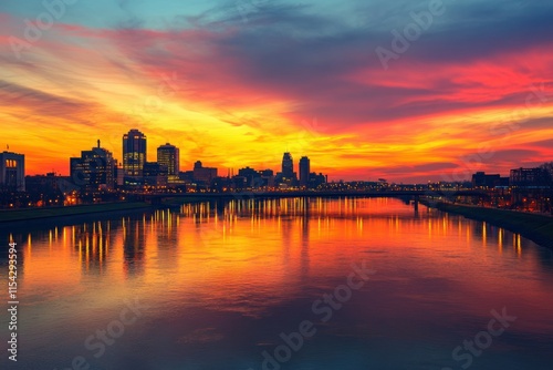 Vibrant Sunset Over City Skyline with Reflective Waters and Dramatic Colors Casting a Beautiful Glow Across the Riverbank