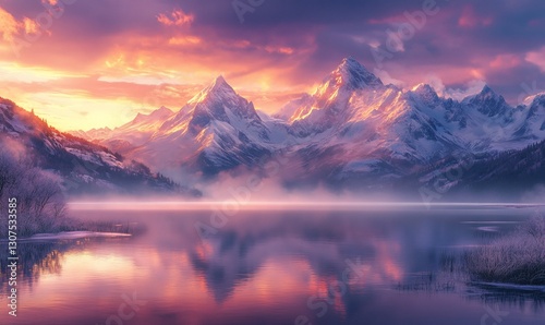 sunset, sunrise, mountain, snow, lake, winter, landscape, nature, scenic, sky, cloud, vibrant, colourful, calm, peaceful, serene, majestic, beautiful, tranquil, cold, frost, ice, peak, range, alps, hill, vale, water, mist, fog, horizon, dawn, dusk, wilderness, scenery, view, panorama, photograph, image, picture, art, graphic