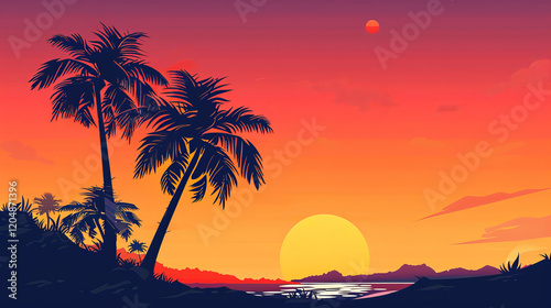 vibrant sunset over tropical beach with palm trees silhouetted against colorful sky. scene evokes sense of tranquility and summer vibes
