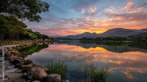 Vibrant Sunset Reflection on Tranquil Lake, Lush Mountains, and Scenic Park Path