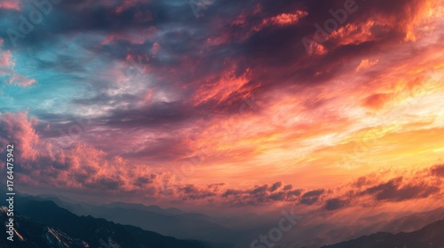 Vibrant sunset sky over distant mountains. Beautiful golden hour clouds at dusk or dawn. Natural landscape background for desktop.