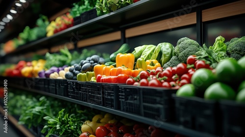 Vibrant Supermarket Produce Aisle with Fresh Fruits and Vegetables.