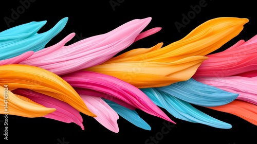 abstract, colourful, swirling, shape, leaf, ribbon, pink, orange, blue, red, vibrant, dynamic, energetic, flowing, stylised, background, black, design, art, texture, modern, graphic, illustration, pattern, wave, curve, line, colours, palette, bright, high-coloured, smooth, glossy, three-dimensional, rendering, digital, artwork, creative, image, visual, contemporary
